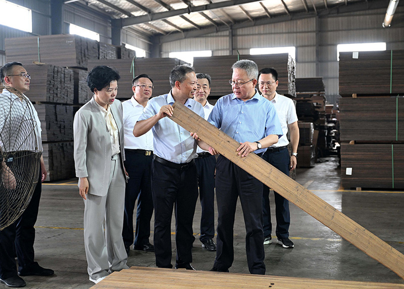 2025年6月16日,省政協副主席虢正貴來湖南桃花江竹材科技股份有限公司調研生態(tài)資源轉化與特色產業融合發(fā)展。公司董事長、省人大代表薛志成陪同并介紹情況。虢正貴充分肯定了桃花江竹材在竹資源利用及竹特色產業融合發(fā)展所取得的成果,他鼓勵企業繼續(xù)發(fā)揮龍頭優(yōu)勢,充分利用好桃江資源稟賦和產業優(yōu)勢,深化產學研融合,提升竹產業附加值,為民族地區生態(tài)資源高效轉化和特色產業融合發(fā)展探索更多經驗。